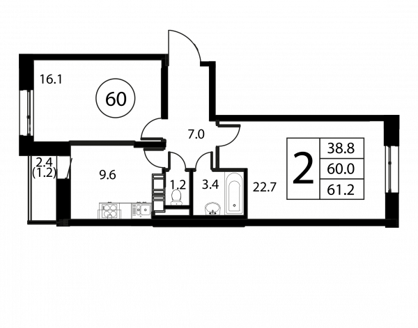 2 комнаты, 61.2 м², Этаж: 5/12, № 60