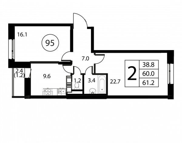 2 комнаты, 61.2 м², Этаж: 12/12, № 95