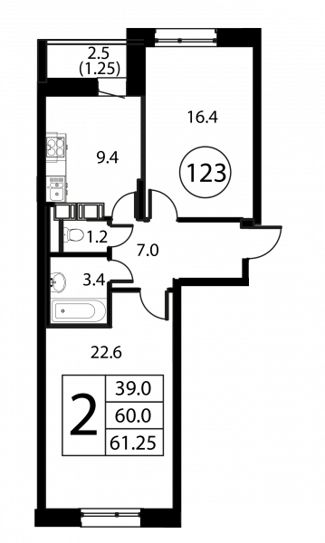 2 комнаты, 61.25 м², Этаж: 7/12, № 123
