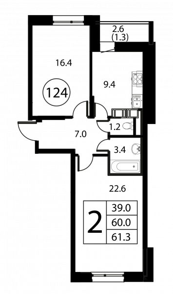 2 комнаты, 61.3 м², Этаж: 8/12, № 124