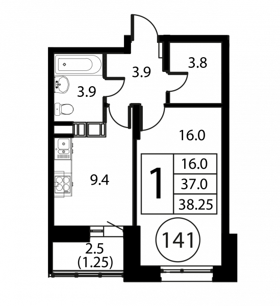 1 комната, 38.25 м², Этаж: 12/12, № 141