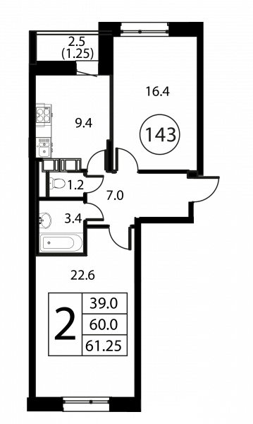 2 комнаты, 61.25 м², Этаж: 12/12, № 143