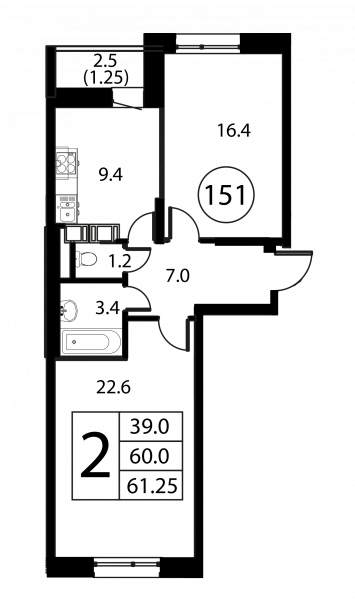 2 комнаты, 61.25 м², Этаж: 3/12, № 151
