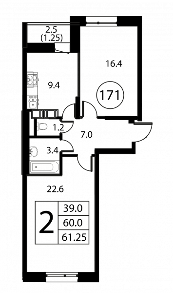 2 комнаты, 61.25 м², Этаж: 8/12, № 171