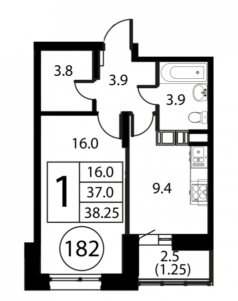 1 комната, 38.25 м², Этаж: 11/12, № 182