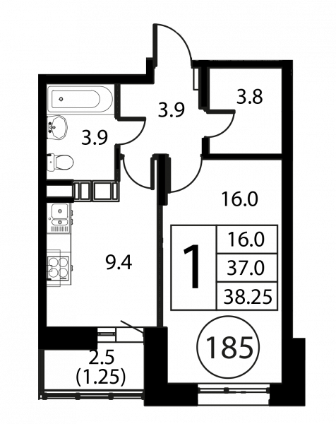 1 комната, 38.25 м², Этаж: 12/12, № 185
