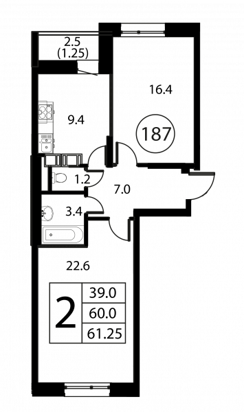2 комнаты, 61.25 м², Этаж: 12/12, № 187
