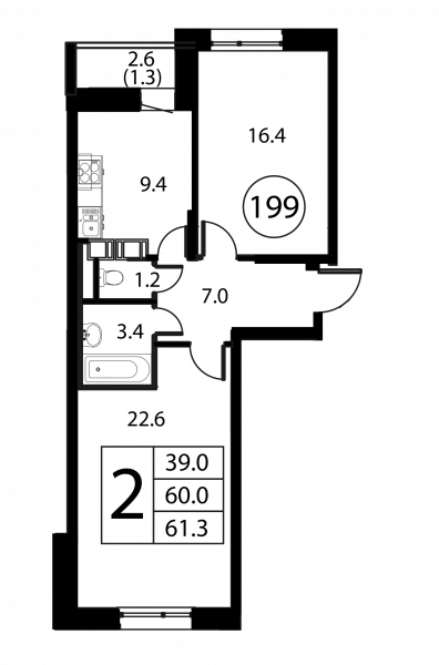 2 комнаты, 61.3 м², Этаж: 4/12, № 199