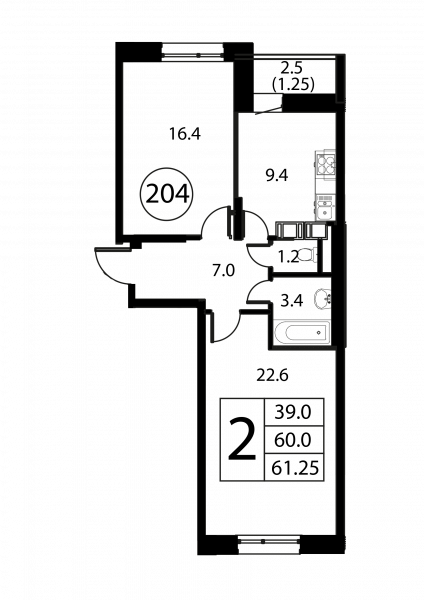 2 комнаты, 61.25 м², Этаж: 6/12, № 204