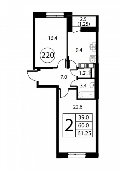 2 комнаты, 61.25 м², Этаж: 10/12, № 220