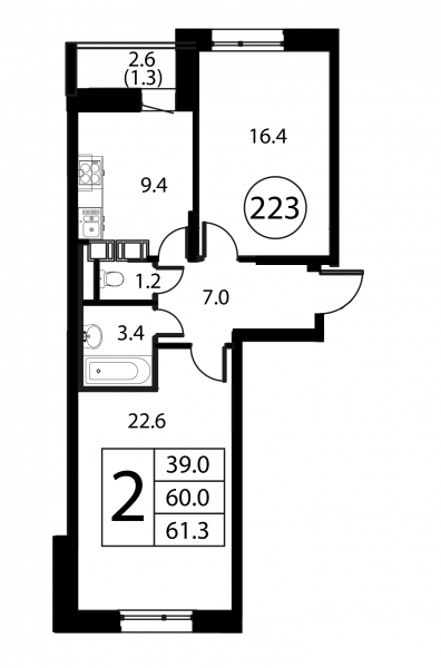 2 комнаты, 61.3 м², Этаж: 10/12, № 223