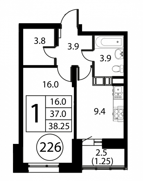 1 комната, 38.25 м², Этаж: 11/12, № 226