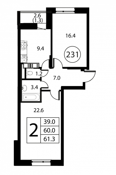 2 комнаты, 61.3 м², Этаж: 12/12, № 231