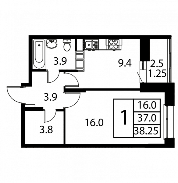1 комната, 38.25 м², Этаж: 12/12, № 358