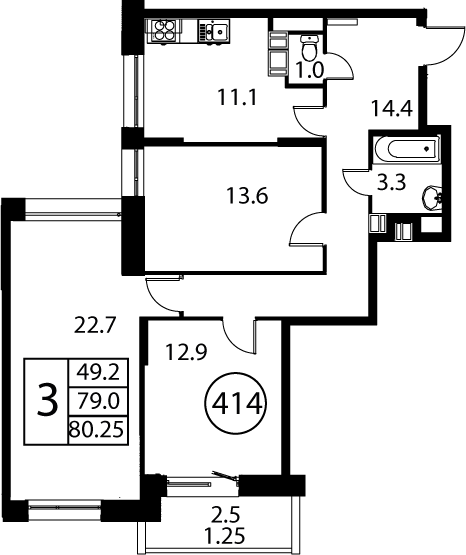 3 комнаты, 80.25 м², Этаж: 11/12, № 414