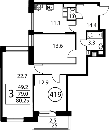 3 комнаты, 80.25 м², Этаж: 12/12, № 419