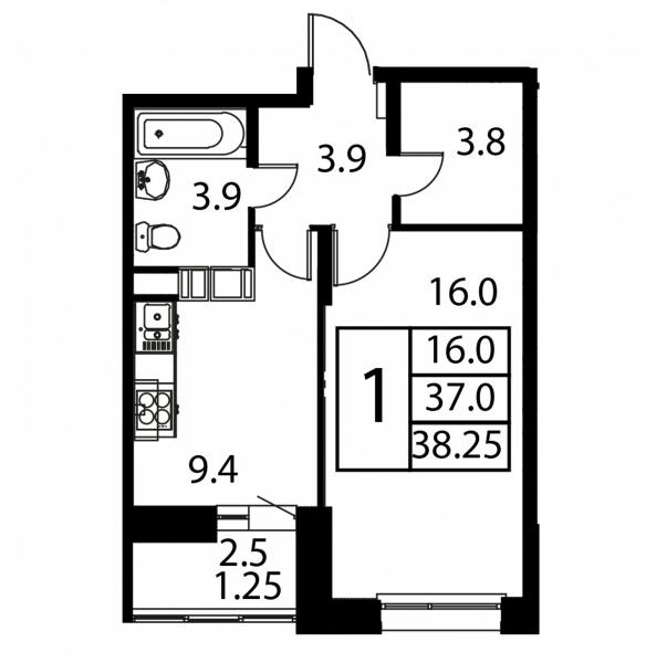 1 комната, 38.25 м², Этаж: 9/12, № 453