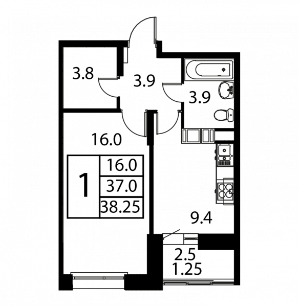 1 комната, 38.25 м², Этаж: 9/12, № 454