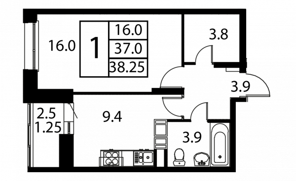 1 комната, 38.25 м², Этаж: 9/12, № 608