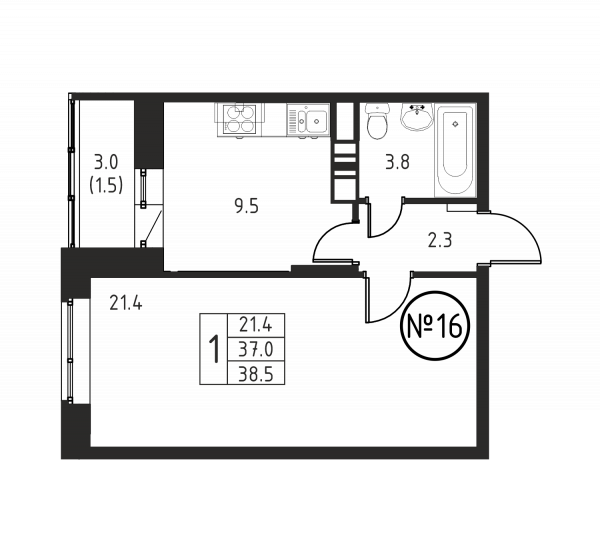 1 комната, 38.5 м², Этаж: 2/12, № 16