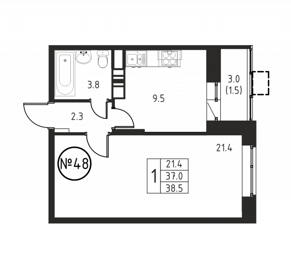 1 комната, 38.5 м², Этаж: 6/12, № 48
