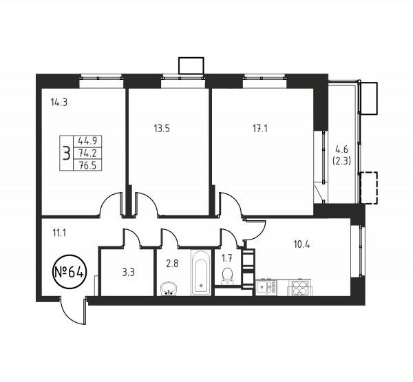 3 комнаты, 76.5 м², Этаж: 8/12, № 64