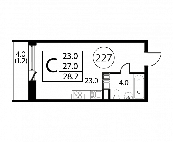 Студия, 28.2 м², Этаж: 2/12, № 227