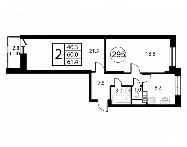2 комнаты, 61.4 м², Этаж: 8/12, № 295