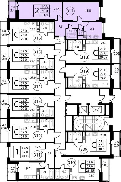 2 комнаты, 61.4 м², Этаж: 10/12, № 317