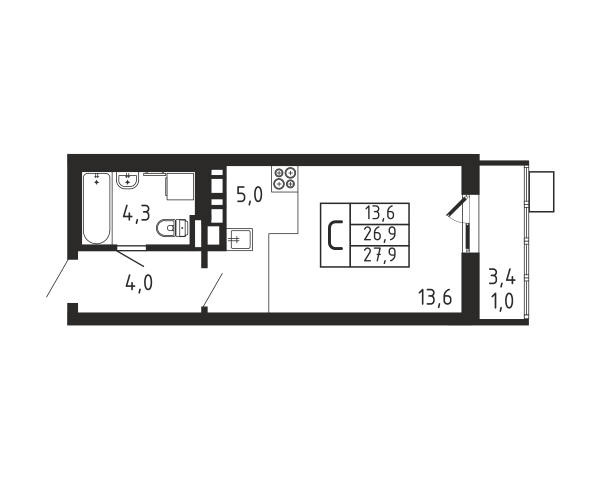 Студия, 27.9 м², Этаж: 6/9, № 342