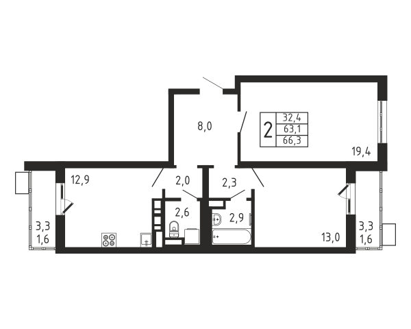 2 комнаты, 66.4 м², Этаж: 7/9, № 358