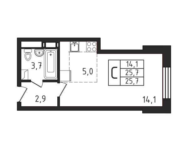 Студия, 25.7 м², Этаж: 6/9, № 49