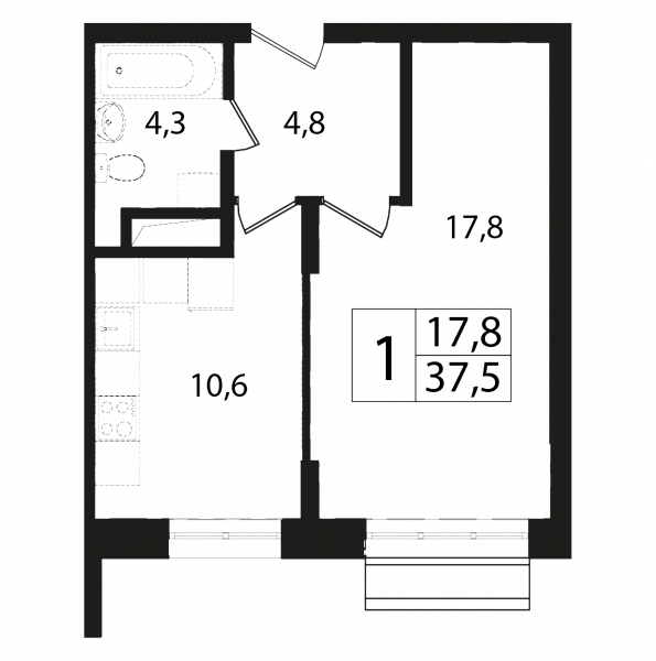 1 комната, 37.6 м², Этаж: 2/17, № 150